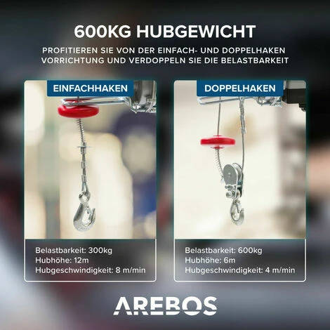 Mit dem Modell AR-HE-SW300 können Sie Lasten von 300-600 kg problemlos heben. Je nachdem, ob Sie mit einfachem Seil (ohne Umlenkrolle) oder mit doppeltem Seil und Nutzung der mitgelieferten Umlenkrolle arbeiten.