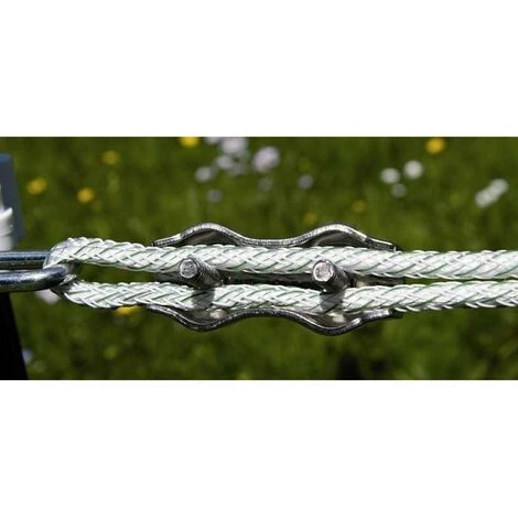 Seilverbinder für Ø 3 – 6 mm, Edelstahl, Stück. Korrektes Verbinden und Spannen von Elektroseil für optimale Stromversorgung. Leichte Montage mit 10er Schraubenschlüssel. Beide Muttern herunter drehen, Platte entnehmen, Seil einlegen, Platte wieder drauf und Muttern fest anziehen.