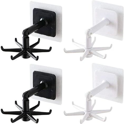 【Was Sie erhalten】 Das Paket enthält 4 um 360°drehbare Haken, darunter 2 Stück weiße Haken und 2 Stück schwarze Haken. Jeder Haken hat 6 Zweige, um die bestmögliche Nutzung zu gewährleisten. Die PVC-Aufkleber sind ebenfalls im Paket enthalten.