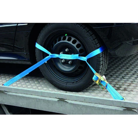 für den Autotransport mittels Umreifung des Rades. aus hochfesten Polyesterfasern (100 %) . Zurrgurt mit Spitzhaken . gefertigt und geprüft nach EN 12195-2 .