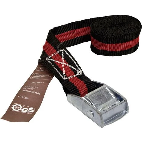 Herstellerfarbe: Schwarz,Rot · Inhalt: 1 St. · Material: Polyester · Produkt-Art: Klemmgurt · Produktabmessung, Breite: 25 mm · Produktabmessung, Länge: 1.5 m · Verschluss (Spanngurte): Klemmschloss · Zugkraft LC Diagonalzurren (doppelt/Umreifung): 250 daN · Zugkraft LC Niederzurren (einzeln/direkt): 125 daN · Zugkraft kg Diagonalzurren (doppelt/Umreifung): 250 kg · Zugkraft kg Niederzurren (einzeln/direkt): 125 kg · Zulassungen, Normen (Spanngurte): EN