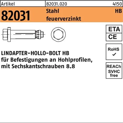 Artikel 82031 Stahl HB feuerverzinkt LINDAPTER-HOLLO-BOLT HB f. Befestigungen an Hohlprofilen · mit Sechskantschraube – Abmessung: HB 08-2 ( 70/41) VE=S (1 Stück)