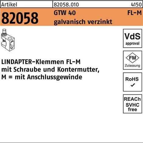 Artikel 82058 GTW 40 FL-M galvanisch verzinkt LINDAPTER-Klemmen FL-M mit Schraube und Kontermutter · mit Anschlussgewinde – Abmessung: FL 1 – M 6 VE=S (1 Stück) Weitere technische Eigenschaften: · Durchmesser 1mm· Form FL-M· Gruppencode 82058.010· Länge 6mm· Normart REYHER-Artikel 82058· Oberfläche galvanisch verzinkt