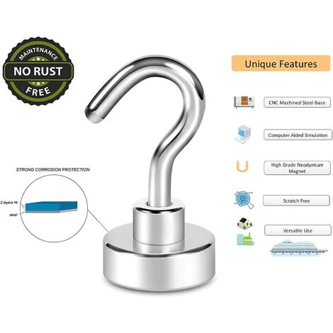- Drei Nickelschichten auf den Magnethaken verstärken die Widerstandsfähigkeit erheblich Korrosion. Wartungsfrei, rostfrei.