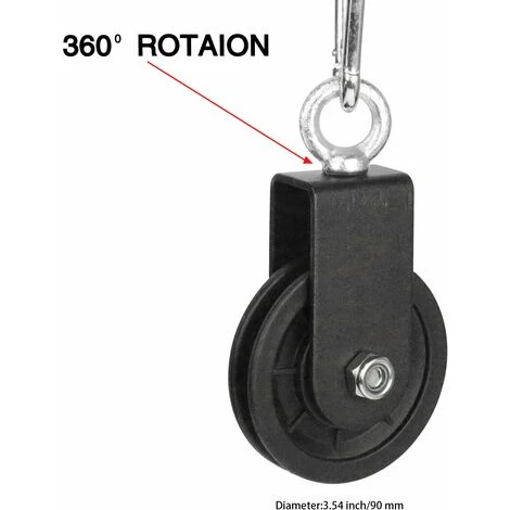 360-Grad-Schwenkrolle: Einzelner Rollenblock mit 90 mm glattem rotierendem Rad, 360-Grad-Schwenkring oben, um zu verhindern, dass sich Seil/Kabel/Draht verheddern.