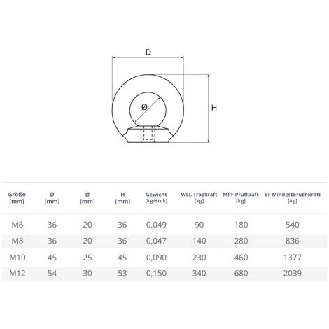 Die entsprechende Größe entnehmen Sie der Tabelle mit den technischen Werten. Wenn das genaue Gewicht der Last nicht bekannt ist, nehmen Sie aus Sicherheitsgründen eine Ringmutter mit einem größeren Gewinde. Beachten Sie, dass die Festigkeit der ganzen Konstruktion durch Seile, Spannschlösser, Kauschen, Haken oder Seilklemmen beeinflusst wird.