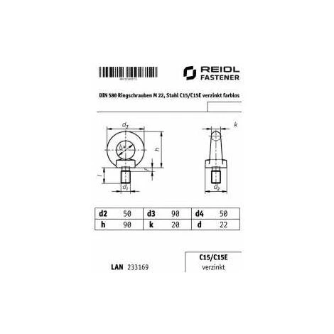 SONSTIGE DIN 580 Ringschrauben M 22, Stahl C15/C15E Verzinkt Farblos