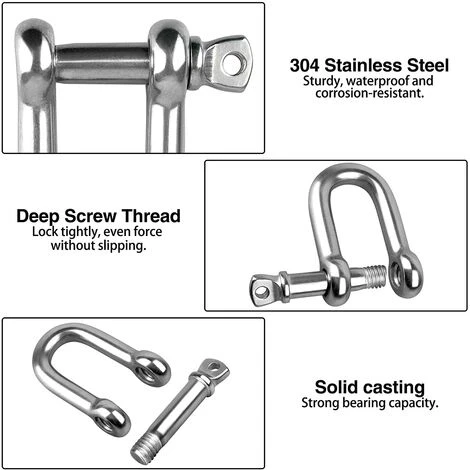Hochwertiges Material: Das D-Ring-Bügelschloss besteht aus Edelstahl 304, das robust und langlebig, rost-, korrosions- und säurebeständig ist. Mit einer speziellen Schmiedebehandlung an der Oberfläche kann der schwere Marineschäkel in feuchten Umgebungen im Innen- und Außenbereich normal funktionieren.